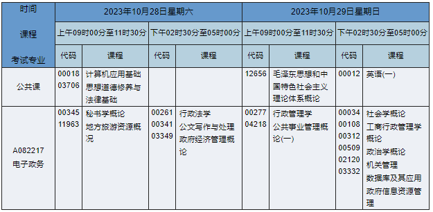 2023年10月湖南自考专科电子政务专业(专业代码:A082217)课程安排如下: