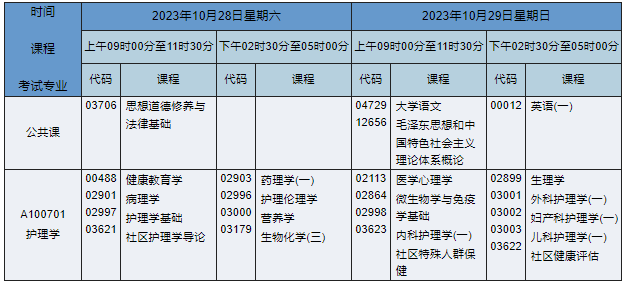 2023年10月湖南自考专科护理学专业(专业代码:A100701)课程安排如下:
