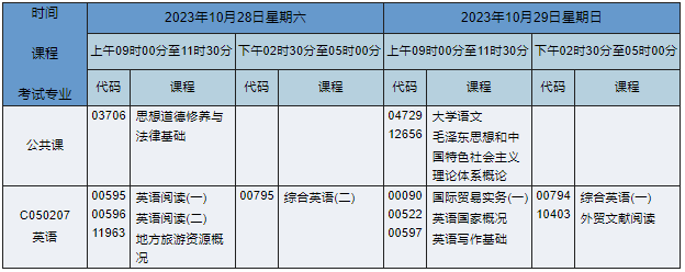 2023年10月湖南自考专科英语专业(专业代码:C050207)课程安排如下: