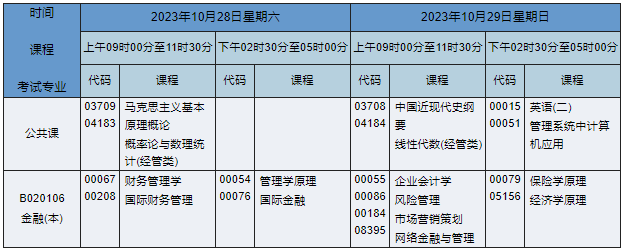 2023年10月湖南自考本科金融专业课程安排表