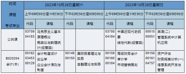 2023年10月湖南自考本科会计专业课程安排表