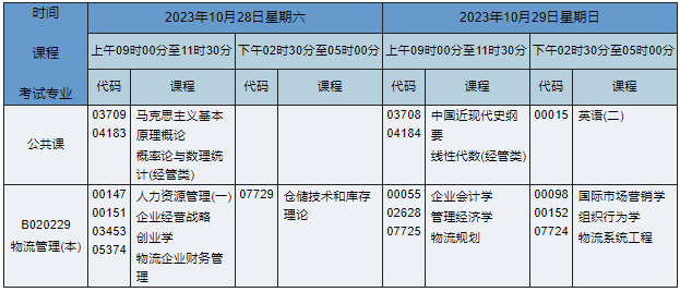 2023年10月湖南自考本科物流管理专业(专业代码:B020229)课程安排如下: