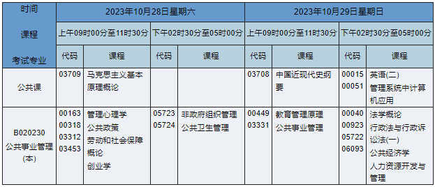 2023年10月湖南自考本科公共事业管理专业(专业代码:B020230)课程安排如下: