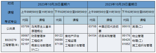 2023年10月湖南自考本科工程管理专业(专业代码:B020279)课程安排如下: