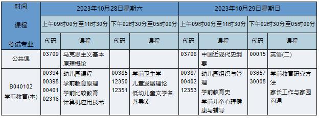 2023年10月湖南自考本科学前教育专业(专业代码:B040102)课程安排如下: