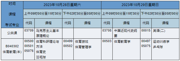 2023年10月湖南自考本科体育教育专业(专业代码:B040302)课程安排如下: