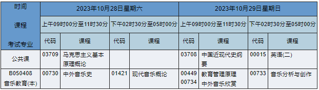 2023年10月湖南自考本科音乐教育专业课程安排表