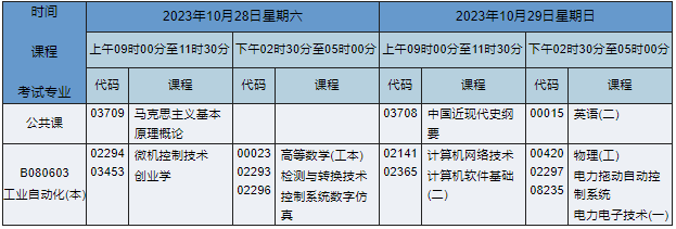 2023年10月湖南自考本科工业自动化专业(专业代码:B080603)课程安排如下: