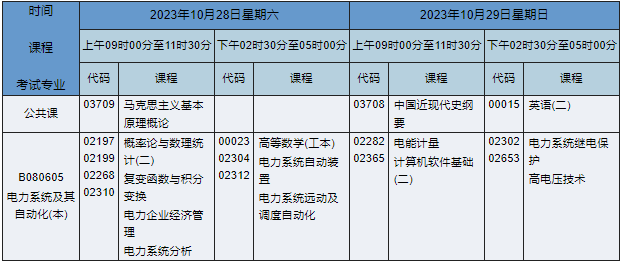 2023年10月湖南自考本科电力系统及其自动化专业课程安排表