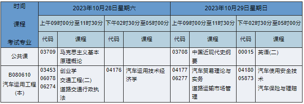 2023年10月湖南自考本科汽车运用工程专业课程安排表