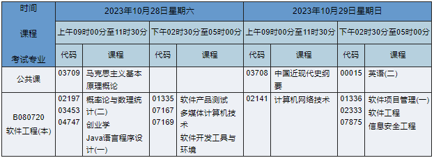 2023年10月湖南自考本科软件工程专业(专业代码:B080720)课程安排如下: