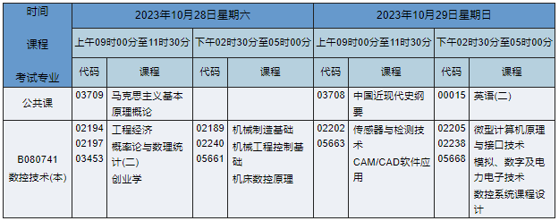 2023年10月湖南自考本科数控技术专业(专业代码:B080741)课程安排如下: