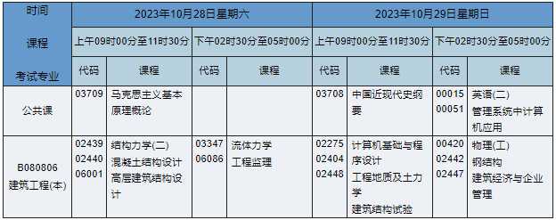 2023年10月湖南自考本科建筑工程专业(专业代码:B080806)课程安排如下: