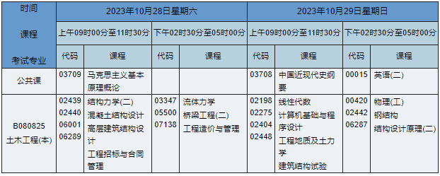2023年10月湖南自考本科土木工程专业课程安排表