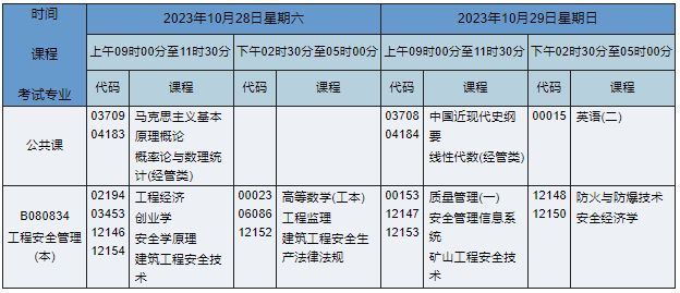2023年10月湖南自考本科工程安全管理专业(专业代码:B080834)课程安排如下: