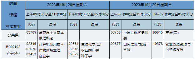 2023年10月湖南自考本科农学专业(专业代码:B090102)课程安排如下: