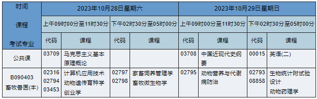 2023年10月湖南自考本科畜牧兽医专业(专业代码:B090403)课程安排如下:
