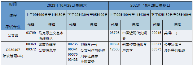 2023年10月湖南自考本科治安管理专业(专业代码:C030407)课程安排如下: