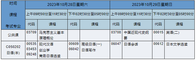 2023年10月湖南自考本科日语专业(专业代码:C050202)课程安排如下: