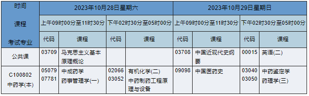 2023年10月湖南自考本科中药学专业(专业代码:C100802)课程安排如下: