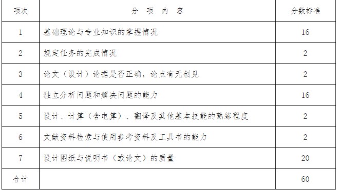 论文指导老师对考生的论文进行撰写指导,给出评语,并对论文撰写情况进行评分(60分),具体内容与分数标准参考见下表。