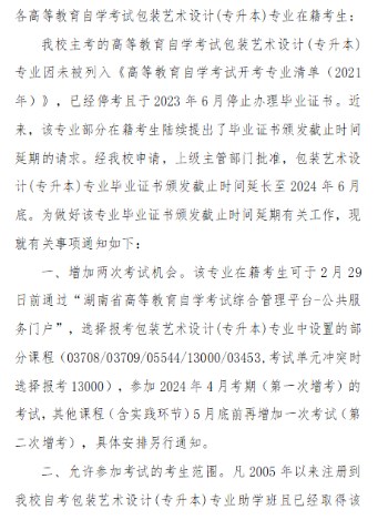 湖南工业大学自考包装艺术设计(专升本)专业毕业证书颁发截止时间延期有关事项的通知