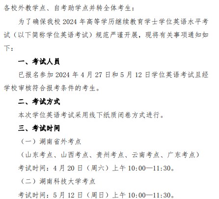 点击查看:湖南科技大学2024年高等学历继续教育学士学位英语水平考试通知
