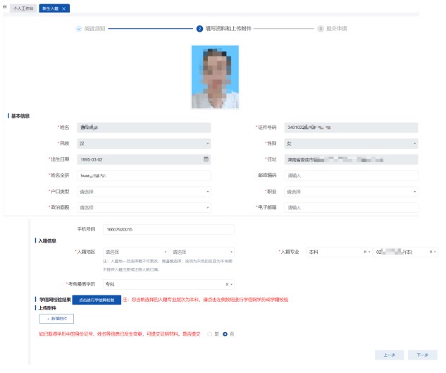 阅读完成《新生报名入籍操作指南》后,勾选界面中显示的“承诺书我已阅读,并同意所有条款。”复选框,跳转到新生入籍填写资料和上传附件界面,弹出如下图所示窗口。