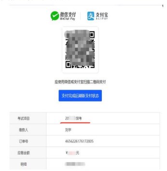 考生使用手机微信或支付宝扫描支付页面上的二维码,按照提示支付所报考课程考试费,如下图所示: