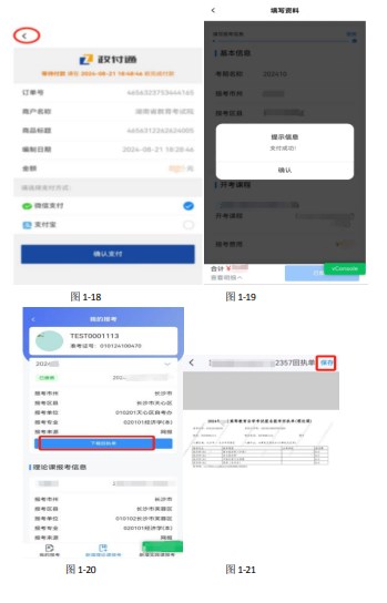第六步下载回执单缴费完成后,进入APP,显示下图1-18界面中,点击左上角的“<”按钮,返回报考界面,如下图1-19所示,点击“确认”按钮,进入如图1-20所示界面,点击“下载回执单”按钮,进入图1-21所示界面,点击右上角的“保存”按钮即可下载回执单至本手机。