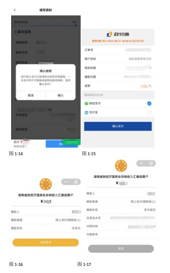 第五步缴纳考试费上图1-13界面,点击“缴费”按钮,进入图1-14界面,请核实报考课程后点击“确认”按钮,进入图1-15界面,点击“确认支付”按钮,进入图1-16界面,点击“立即支付”按钮,输入支付密码完成支付后,进入图1-17界面,显示缴费状态为“支付成功”即可点击“关闭”按钮完成支付流程。