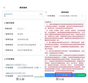 考生阅读完《阅读须知》后,勾选界面中显示的“承诺书我已阅读,并同意所有条款”复选框,等待界面右下侧倒计时按钮数据为0,显示“下一步”按钮后,点击“下一步”按钮跳转至“填写报考资料”界面。如下图所示: