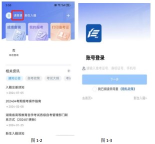 第二步考生APP登录。个人手机上,点击安装好的潇湘自考APP图标,进入门户首页,如下图1-2所示,点击左上角的“请登录”连接,进入登录界面。