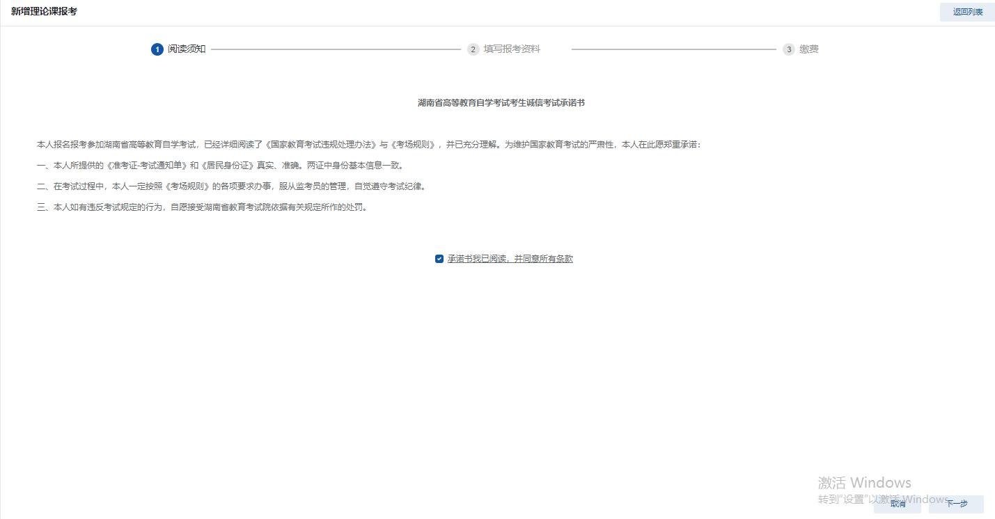 点击上图 1-8 报考界面下方的“新增理论课报考”图标,进入图 1-9界面,阅读完阅读须知,并勾选“承诺书我已阅读,并同意所有条款!”再点击“下一步”按钮,进入图 1-10 界面,选择报考市州、报考区县、报考单位、报考专业及开考课程(报考课程),再点击“下一步”按钮,进入图 1-12 界面,点击“确认”按钮,锁定本次报考名额。