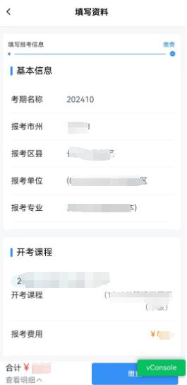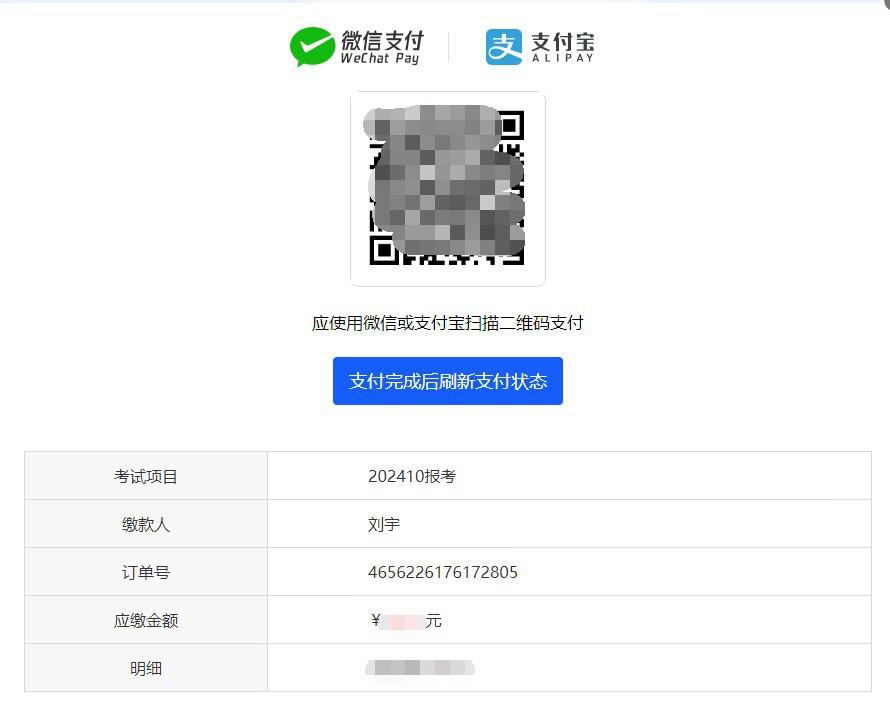 考生使用手机微信或支付宝扫描支付界面上的二维码,按照提示支付所报考课程考试费,如下图所示: