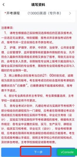 考生阅读完《阅读须知》后,勾选界面中显示的“承诺书我已阅读,并同意所有条款”复选框,等待界面右下侧倒计时按钮数据为 0,显示“下一步”按钮后,点击“下一步”按钮跳转至“填写报考资料”界面。如下图所示: