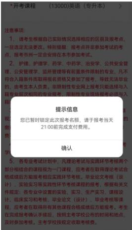 考生确认报考信息无误后,点击右下角“下一步”,系统会出现“您已暂时锁定此次报考名额,请于报考当天 21:00 前完成支付费用”提示信息,如下图所示: