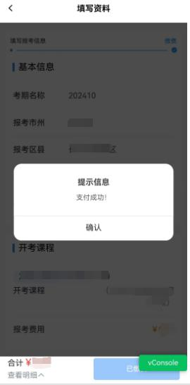 第六步报考确认。考生完成上述操作后,点击支付界面右上角“X”关闭按钮。关闭支付界面后,可返回报考系统查看本次缴费成功的报考课程信息(缴费状态为“已缴费”),如下图所示: