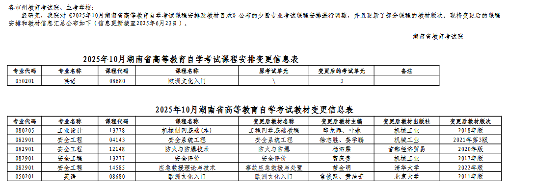 湖南省2025年10月高等教育自学考试课程安排和教材变更汇总表