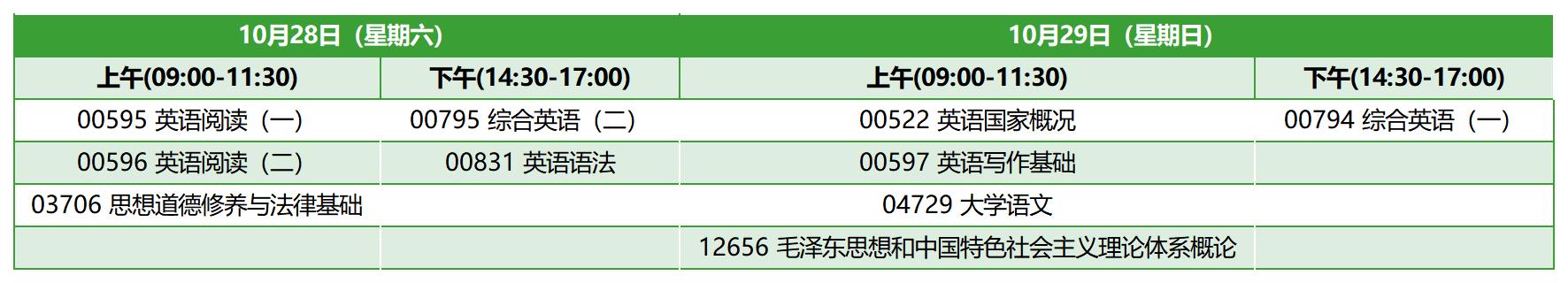 10月28日-29日开考的2023年10月江苏自考专科英语专业,专业代码:X1970202(原专业代码:1050207),每天有两场考试,分别在上午9点-11点半,下午2点半-5点,每场考试时长150分钟。