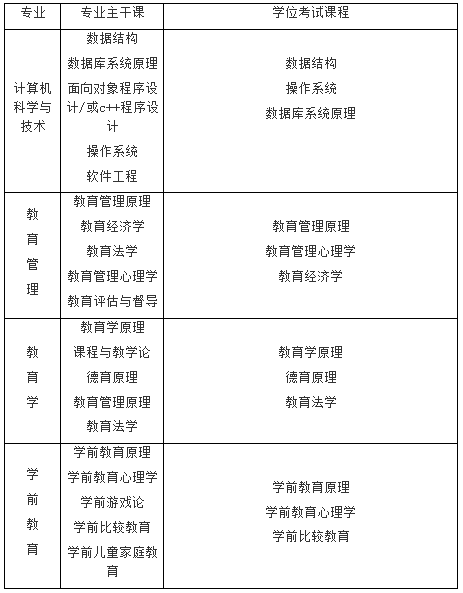 根据江西省人民政府学位委员会《江西省普通高等学校授予成人高等教育本科毕业生学士学位暂行办法》(赣学位[2009]1号)的要求,江西师范大学自学考试主考专业学位专业主干课程如下表:
