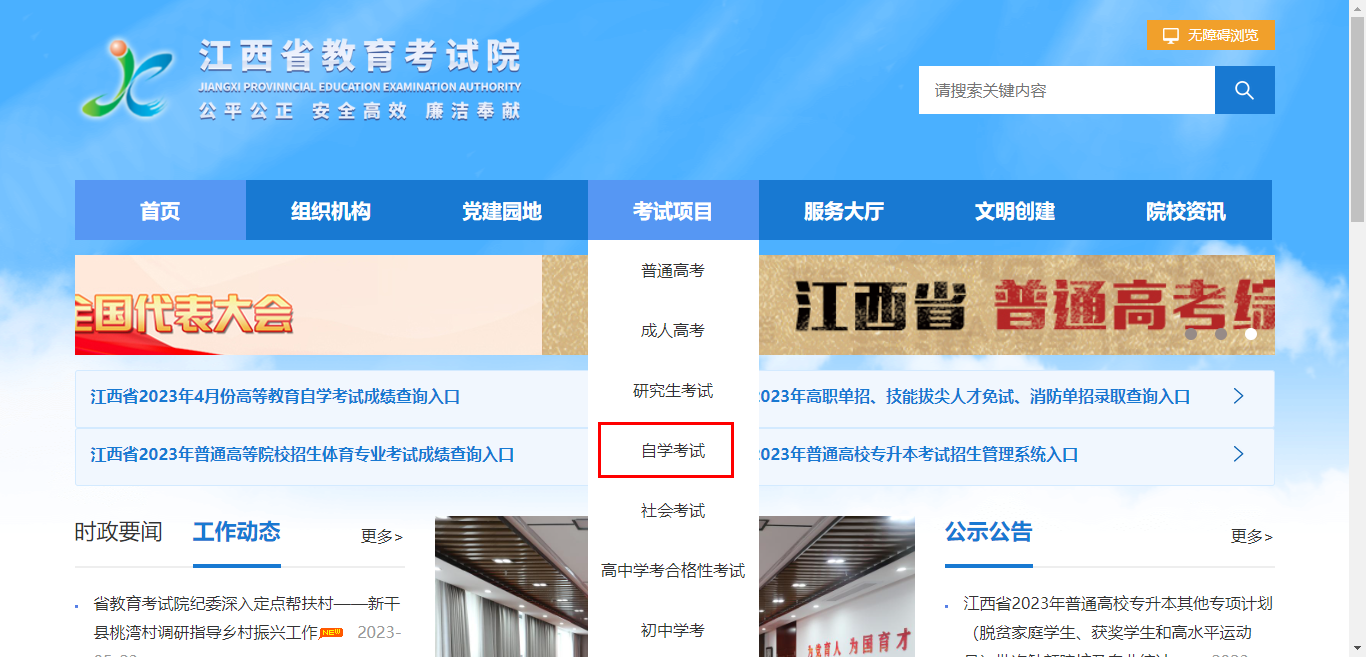 2、已注册考生登录江西省教育考试院网站进入报名入口,点击首页导航栏的“考试项目-自学考试”。