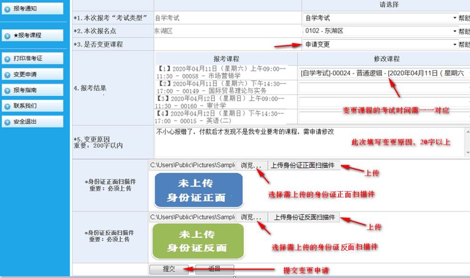 4) 填写申请表时请写清楚变更的原因,并上传相应的证明文件;(身份证正面扫描件、身份证反面扫描件等)