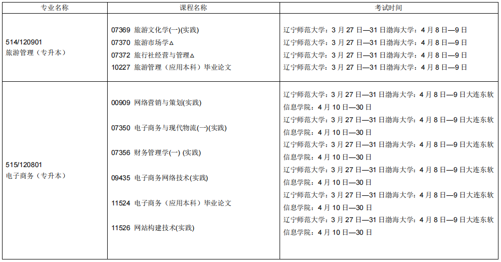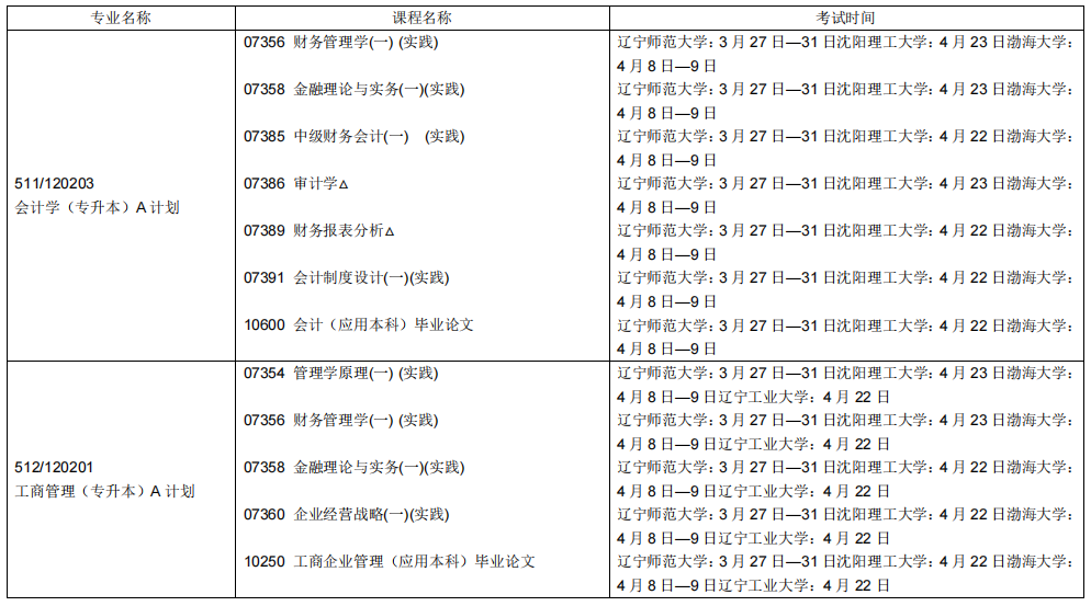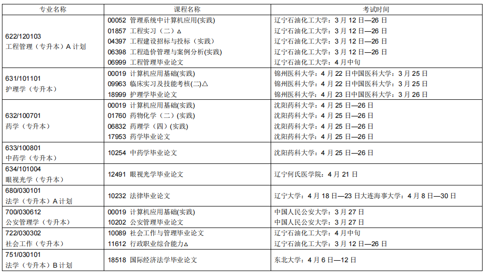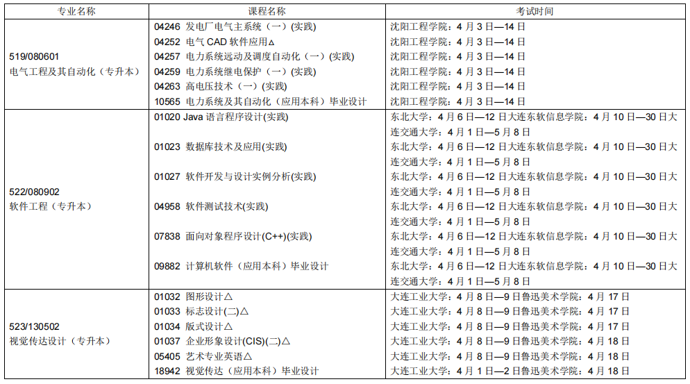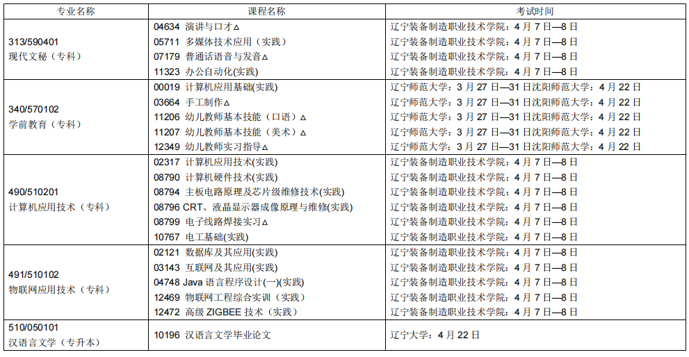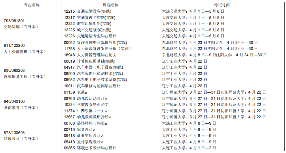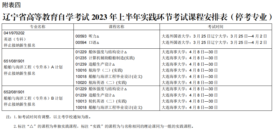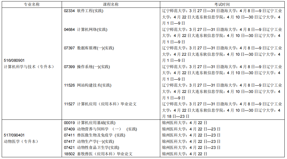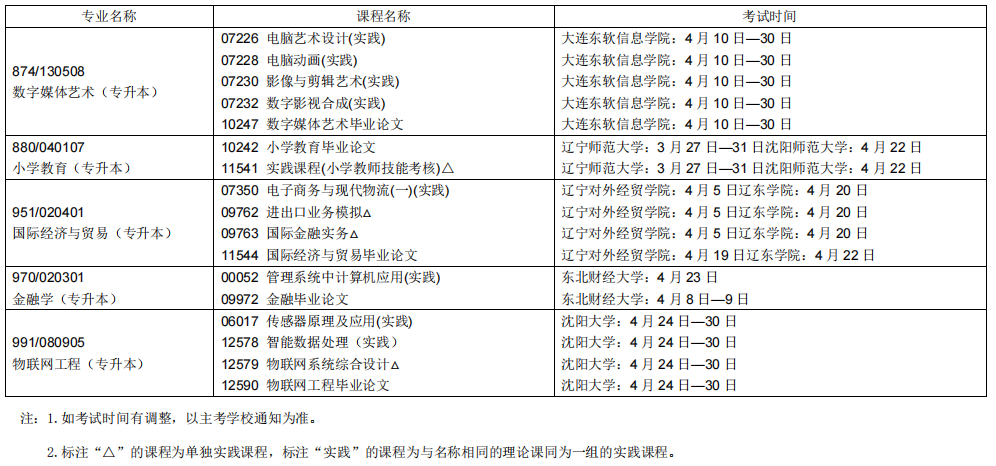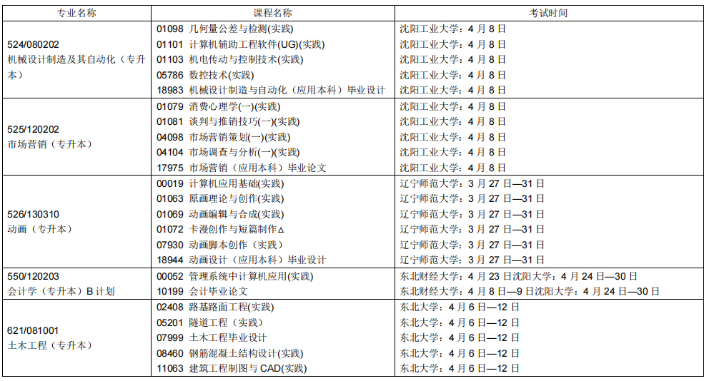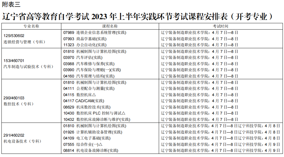 辽宁省高等教育自学考试2023年上半年实践环节考试课程安排表