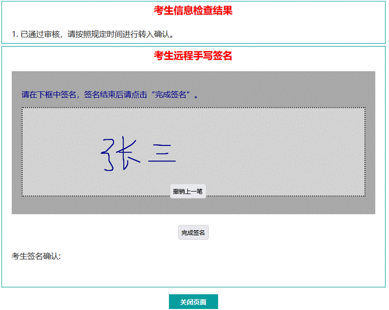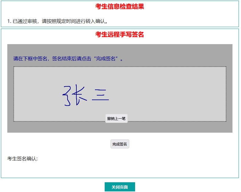 考生核实转入信息后,直接在如图灰色签名区域中用鼠标进行签名,签名过程中可以点击“撤销上一笔”进行撤销操作。签名完毕后点击“完成签名”进行签名确认。