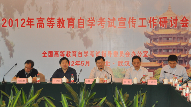 5月19日,由全国高等教育自学考试指导委员会办公室主办的2012年高等教育自学考试宣传工作研讨会在湖北武汉召开。教育部考试中心党委书记刘军谊出席会议并讲话,湖北省教育厅副厅长徐雁冰出席会议并致辞。教育部考试中心自考综合处、助学管理处处长王建民,自考综合处副处长王海东、助学管理处副处长沈漪、考务管理与监察处副处长时雨,湖北教育考试院党委书记、院长江畅,纪委书记刘晓林等参加会议。来自17个省、自治区、直辖市自考办的40余位代表和《中国教育报》、“中国教育在线”的代表与会。会议由王海东同志主持。