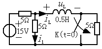 1. 如图所示电路中,原电路已处于稳态,t=0时开关闭合,试用三要素法求t≥0时的il,i1以及uL。