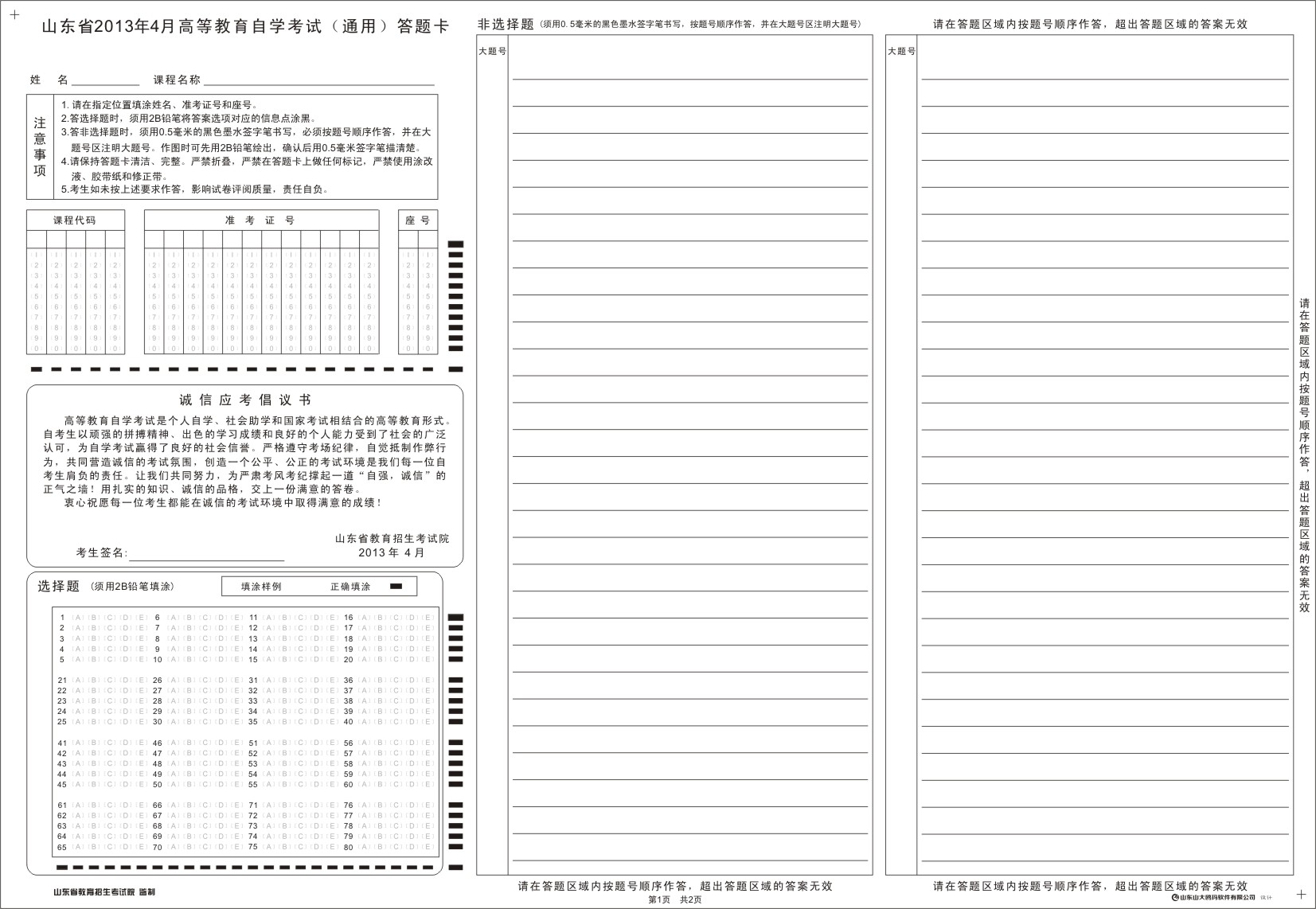 山东泰安2013年7月自考须知及答题卡样式图