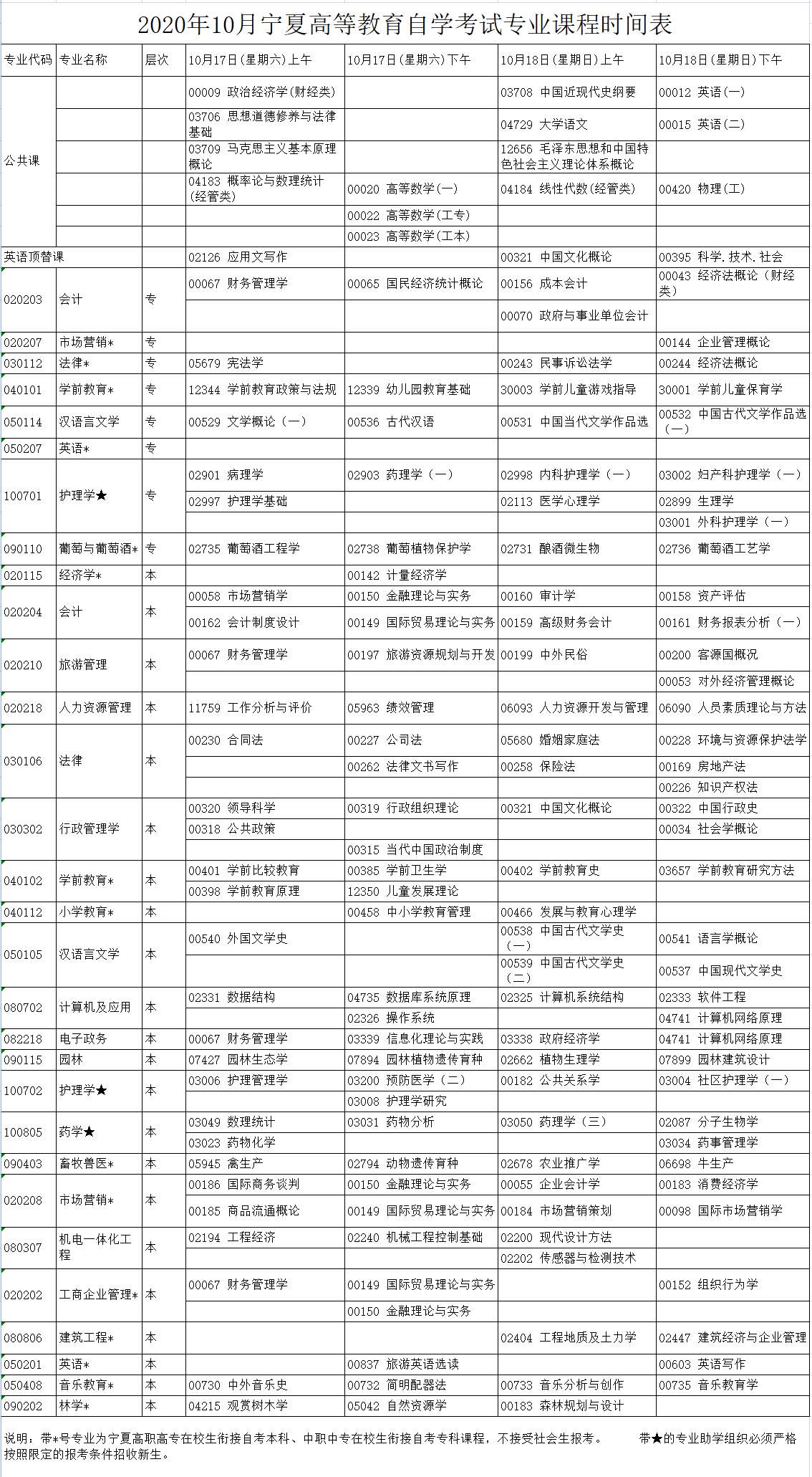 2020年10月宁夏自考考试安排已公布,如下:
