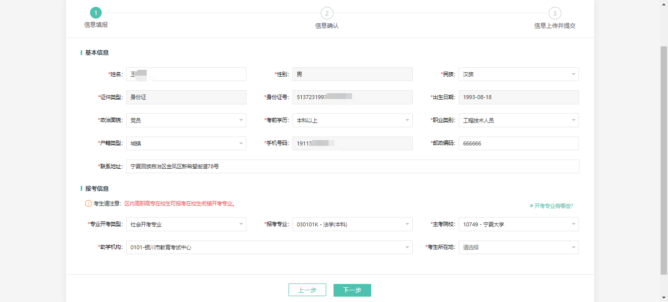 考生填写信息后,点击“下一步”进入信息确认页面。考生请仔细确认所填写的信息是否有误。